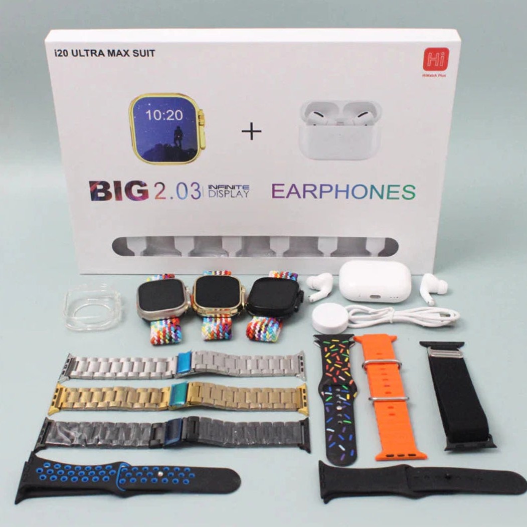 I20 ultra max suit smart watch set combination wrist earphone + watch i20 Ultra I20 ultra max suit smartwatch 10 in 1 Function: COMPASS, Calendar, Alarm Clock, Power Reserve, Remote Control, Sleep Tracker, Fitness Tracker, Calculators, Passometer,Call Reminder, Answer Call, Push Message, Message Reminder ,Dial Call, Heart Rate Tracker, Big Three Needles, Gesture control Introducing the (10 in 1 Set) i20 ULTRA MAX SUIT SmartWatch + Aiirpod s Pro with Transparent Screen Guard Watch and Seven Decorated Straps – Your Ultimate Tech Companion! See Clearly: With a crisp 320*240 resolution, the Smart Watch's display brings your world to life. Every glance becomes an experience, from checking messages to tracking your fitness journey. Your Multitool: This isn't just a watch; it's your personal assistant. It plays your favourite MP3s, responds to your touch with grace, and obeys your every command through easy APP control. Life's Essentials: Your new sidekick comes equipped with a compass, calendar, and a trusty alarm clock. No need to worry about running out of juice; the power reserve has you covered. And for those times when you need remote control capabilities, it's right at your wrist. Your health comes first: Specify your goals in detail. Utilize exercise tools like pedometers and calculators, keep an eye on your heart rate, and track your sleep habits. Stay Connected: Missed calls and messages are a thing of the past. Call reminders and message notifications keep you in the loop, and you can even answer calls directly from your wrist. Stay in touch effortlessly with push messages and friendly message reminders. Navigate with Style: Effortless gesture control adds a touch of magic to your daily routine. Your SmartWatch understands your movements, making it a breeze to navigate. Express Yourself: With seven beautifully decorated straps to choose from, your SmartWatch can match your outfit and mood effortlessly. Elevate your tech game and take control of your life with the (10 in 1 Set) i20 ULTRA MAX SUIT SmartWatch + Aiirpods Pro. It's more than a gadget; it's a companion that understands your needs and style. Get yours today and experience a personalized, tech-savvy lifestyle.